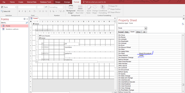 En el evento Intervalo lo puse a 10,000 (cada 10 segundos) y en el evento Al Cronometro puse el código del Link de Microsoft. Esto es a nivel de Propiedades del Formulario.