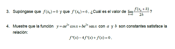 $$\begin{align}&f'(x_0)=\lim_{h \to 0} \frac{f(x_0+h)-f(x_0)}{h}= \lim_{h \to 0} \frac{f(x_0+h)-0}{h}=\lim_{h \to 0} \frac{f(x_0+h)}{h}=6\\&\\&==>\\&\\&\lim_{h \to 0} \frac{f(x_0+h)}{2h}=\frac 6 2=3\\&\\&2.-\\&y=ae^{2x}cosx +b e^{2x}sinx\\&\\&y'=2ae^{2x}cosx -ae^{2x}sinx+2be^{2x}sinx+be^{2x}cosx\\&\\&y''=4a e^{2x}cosx-2ae^{2x}sinx-2ae^{2x}sinx-ae^{2x}cosx+4be^{2x}sinx+2be^{2x}cosx+2be^{2x}cosx-be^{2x}sinx=\\&\\&3ae^{2x}cosx-4ae^{2x}sinx+3be^{2x}sinx+4be^{2x} cosx\\&\\&y"-4y'+y=3ae^{2x}cosx-4ae^{2x}sinx+3be^{2x}sinx+4be^{2x} cosx-4(2ae^{2x}cosx -ae^{2x}sinx+2be^{2x}sinx+be^{2x}cosx)+(ae^{2x}cosx +b e^{2x}sinx)=4a e^{2x}cosx+··········\\&\end{align}$$