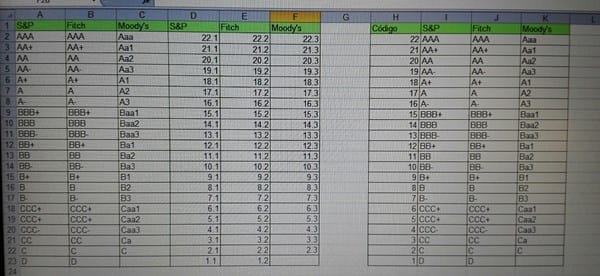 Amazon esta calificada por S&P: AAA, Fitch AA+, Moody's BBB+ que la fórmula me indique cual es la calificación más baja, le he puesto valores a las letras a fin de que el excel identifique cuanto valen las letras, pero necesito saber qué fórmulas serían las más indicadas para cualcular esto.