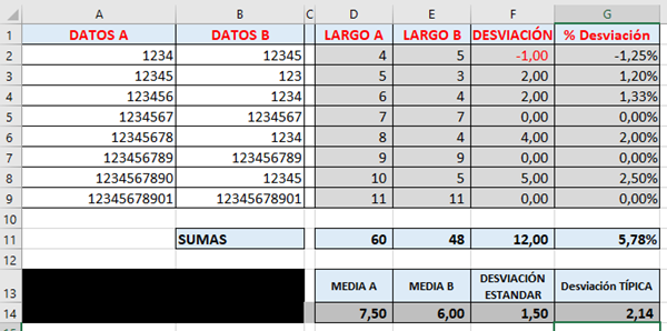 ¿Cómo contabilizo la cantidad de caracteres de dos columnas a comparar en una misma página en excel?