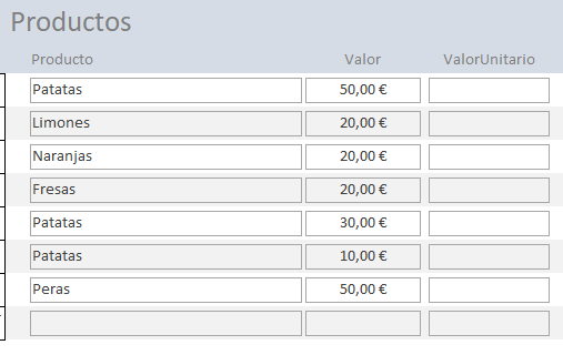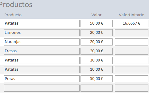 En la tabla construí dos campos que llamé respectivamente: VALOR y CODIGO. He agregado a la misma tabla, un campo calculado al que nombréVALOR UNIDAD donde pretendo dividir el dato del campo [VALOR] entre el número total de registros con el mismo código o referencia que aparecen en la columna [CODIGO]