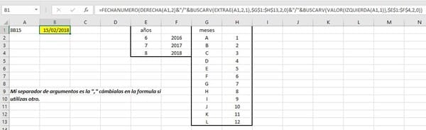 Por ejemplo 8B15 el ocho indica el año (2018) la b indica mes (febrero) y los dos últimos dígitos el día 15 nuestra fecha de elaboración quedaría así 15/febrero/2018 y no se como hacerlo en Excel me podrían ayudar por favor ya que son para mi inventario y son como 10000 productos