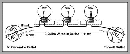 Se debe construir un dispositivo para conectar la fuente de alimentación al generador muerto. Cada extremo debe tener enchufes macho de 3 alambres, dos alambres de calibre 12 a 16 de aproximadamente 6 pies de largo, y se requieren 3 lámparas de luz. El cable blanco está conectado desde el lado derecho (sosteniéndolo) o desde el lado izquierdo (mirando la cara) de los enchufes macho. El cable positivo (negro) debe tener 3 lámparas conectadas en serie, de modo que la electricidad fluya a través de cada bombilla de un extremo a otro. Esto se logra más fácilmente al instalar 3 lámparas de porcelana en una placa y conectarlas en serie, pero se puede emplear cualquier método conveniente que no corto los cables en una emergencia. Coloque bombillas de 60 vatios en cada accesorio.