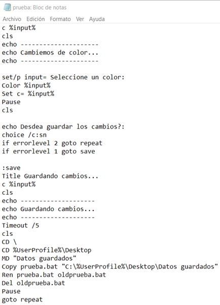 Me gustaría saber cómo podría hacer cambios en un archivo por lotes que se esté ejecutando y que pueda guardarlo... He probado con el comando "set", pero solo me sirve para la sesión actual. Un ejemplo es tener un menú y que puedas escoger el color que quieras para que cuando habrás ese menú tenga siempre ese color sin tener que entrar en "editar" y escribir "Color A", por ejemplo.