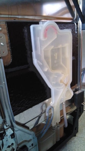 Es la cámara de vahos, se puede soltar, desenroscando el tapón que lleva dentro del lavaplatos en esa misma pared del lavaplatos.
