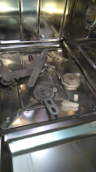Retira todo lo que puedas del fondo del filtro, y deberías ver una lengüeta, con tornillos o de tirador para sacarla y poder ver como están las aspas del motor de desagüe, pueden haber trozos de plato, plásticos, fibras o cristales. Cuidado no te cortes, revisa que la bomba gira bien y esta limpia.