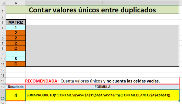 En mi ejemplo, queda como se ve en la foto: hay 4 valores únicos entre una matriz de 8 filas (no cuenta las celdas vacías)