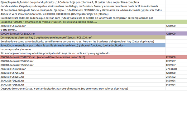 Ejemplo para que de resultados, la función de quitar duplicados , 1º Ordenar hoja por columna A, 2º quitar rutas, copiar línea completa, donde existan, Carpetas y subcarpetas, abrir ventana de dialogo, Buscar y eliminar caracteres hasta la 1ª línea inclinada 3º editar ventana dialogo de búsqueda. Ejemplo..: ruta1\Zanussi FCS1020C.rar y eliminar hasta la barra inclinada (\) y buscar todos. Excel mostrará la cadena com (ruta1) y aquí esta el detalle, en la forma de reemplazar, si reemplazamos por la cadena "000000-" estamos en la misma situación, existirá una cadena como…..Zanussi FCS1020C.rar y otra como…000000-Zanussi FCS1020C.rar. Como puedes observar hay 2 duplicados en el nombre "Zanussi FCS1020.rar"Excel no lo ve como valor duplicado, sencillamente porque no lo es. Pero en las 2 cadenas del ejemplo si hay (Datos duplicados).Solución, al reemplazar por... dejar la casilla sin nada (en blanco) y ahora si funciona, (quita duplicados),haz una prueba y lo veras…..Sin embargo reconozco que la idea principal a sido suya de lo cual le estoy muy agradecido. Después de ordenar Datos. El mensaje es, (no se encontraron valores duplicados). Repito la idea suya me dio
