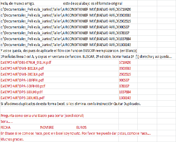 ahora las copias son siempre de la misma carpeta, pero cuando vi mi error ya tenía añadidas un montón de líneas. Quiero dejar limpia esta hoja, pero son muchas líneas a revisar, 21.331 líneas, poquito a poco lo estoy haciendo con la (Función) Extrae pero quería saber si existe otra idea y seguro que la hay, en Excel no lo domino bien, con Dbase III si se puede hacer, pero con Excel, me queda que estudiar.