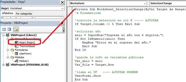 En la hoja tendrás la macro del SelectionChange. En mi ejemplo utilizo la col E .