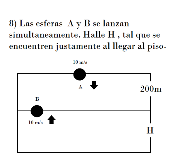$$\begin{align}&y_a(t) = (200+H) - 10 m/s \cdot t - 1/2 g t^2\\&y_b(t) = H + 10 m/s \cdot t - 1/2 g t^2\\&\text{Voy a dejar de lado las unidades de medida y a usar como aproximación para g el valor }g=10m/s^2\\&y_a(t) = 200+H - 10 t - 5 t^2\\&y_b(t) = H + 10 t - 5 t^2\\&y_a(t)=0 = 200+H - 10 t - 5 t^2\\&y_b(t) =0= H + 10 t - 5 t^2\\&\text{Sabemos que ambas llegarán al mismo tiempo al piso, por lo tanto planteamos}\\&200+H - 10 t - 5 t^2 = H + 10 t - 5 t^2\\&200 - 10 t = 10 t\\&200=20t\\&\to t = 10\\&\text{Reemplazamos en cualquiera de las 2 ecuaciones (yo lo voy a hacer en la segunda)}\\&0 = H + 10\cdot 10 - 5 \cdot 10^2\\&0 = H + 100-500\\&0 = H - 400\\&H = 400\\&\text{Por lo que las expresiones originales quedan:}\\&y_a(t) = 600 - 10 m/s \cdot t - 5 m/s^2 \cdot t^2\\&y_b(t) = 400 + 10 m/s \cdot t - 5m/s^2 \cdot t^2\\&\text{Verifiquemos}\\&y_a(10) = 600 - 10 \cdot 10 - 5 \cdot 10^2=600-100-500=0\\&y_b(10) = 400 + 10 \cdot t - 5 t^2=400+100-500=0\end{align}$$Salu2