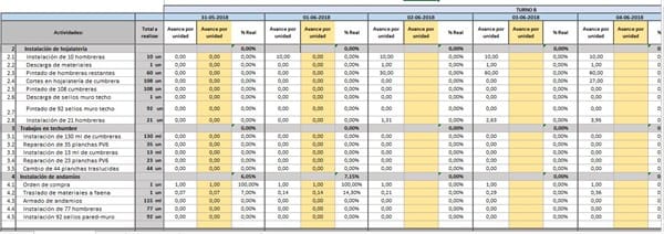 En mi planilla el avance real en blanco es el objetivo diario (a lo que debería llegar diariamente), luego, las celdas a color son las que deben rellenar diariamente si por ejemplo en la primera tarea, ponen 10 hombreras, sería el 100%, entonces desearía que la gente no pusiera el mismo datos cada día (10), ya que primero es repetitivo y segundo se presta para errores quisiera que hubiera alguna forma de que si el valor real es 100% entonces se repita el mismo valor colocado en la celda a color hasta el final del proyecto.