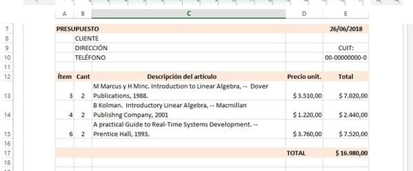 3. En la hoja "Presupuesto", la fila del "total" debería adaptarse a la cantidad de filas copiadas