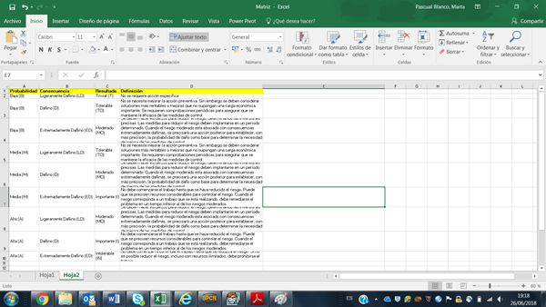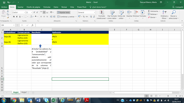 Tengo un excel con dos hojas. En la 1a hoja tengo una matriz que incluye 3 columnas y 9 filas. En función de los valores en las columnas 1 y 2, el valor de la tercera columna difiere.