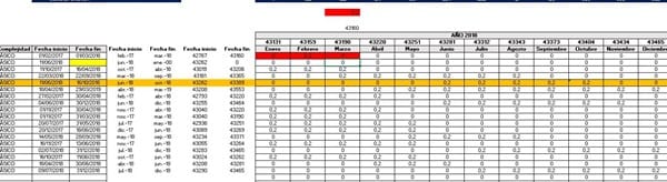 Estoy intentando hacer una fórmula en excel que el rango de fecha que le indico " Inicio" y " Final", verifique si existe un mes en ese rango y en ese caso poner un valor que le digo.