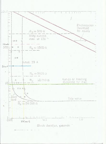 Me ha pillado... La línea lila correspondiente a una corriente de 110mA, es errónea como correspondiente a una resistencia corporal de 500 Ohmios (en el gráfico en 240mA para tensión de 120V ) debe situarse en los 440mA para una tensión de 220V, o sea más arriba, con lo que el nivel de electrocución más bajo, se alcanza pasados unos 70 milisegundos.Es cierto que la electrocución depende de la corriente y los niveles correspondientes a varias resistencias corporales Rb (horizontales 12.000, 8.000, 1.500 y 500 Ohmios) son diferentes según la tensión. Estos niveles se incluyen en el gráfico para poner de manifiesto la importancia del tiempo en la desconexión del diferencial. Saludos. - Botijo Antiguo