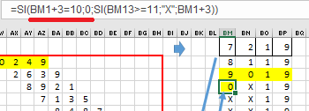 Cells(y, 66).FormulaR1C1 = "=IF(IF(R1C=0,10,R1C)-1<=-1,""X"",IF(R1C=0,10,R1C)-1)"