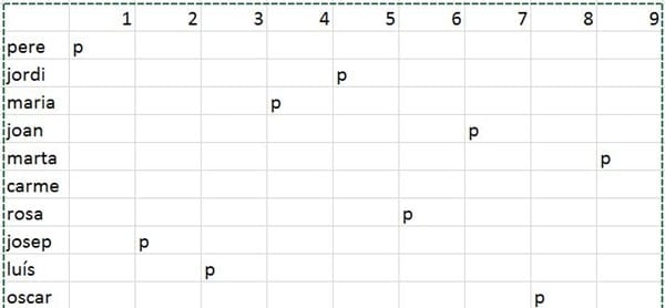 Supongamos que tengo una matriz de 10x10 y si por ejemplo en la columna 8 hay en la fila 5 hay una "p" que me devuelva el valor de la fila 5 pero en la columna 1.
