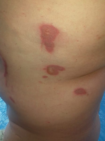 Quitándole unas ramas secas a un cedro del Líbano que tengo en el jardín, se me han producido unas lesiones como quemaduras, con ampollas. Apenas me molestan, solamente las ampollas picaban un poco, pero las lesiones son muy aparatosas y muy coloreadas.