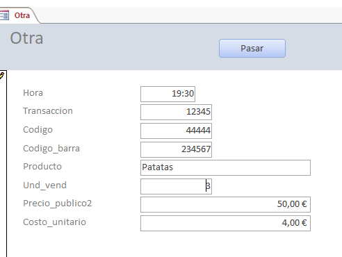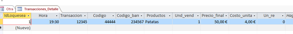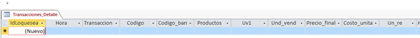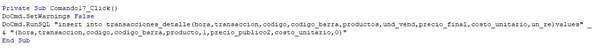 DoCmd.RunSQL "insert into [Transaciones_Detalle]([Hora],[TRansacion],[Codigo],[Codigo_barra],[Productos],[Un_Vend],[Precio_Final],[Costo_Unitario],[Un_Re])values(hor, tran, cod, codb, prod, UV1,precio,costo,ur)"