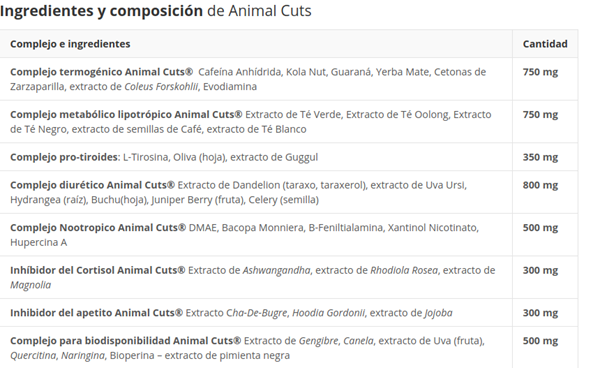 Alguien sabe los ingredientes que trae cada color de cápsula de animal cuts?
