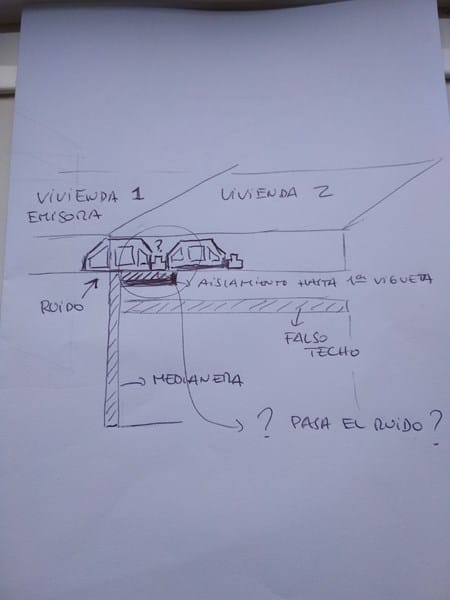 Se trata de dos viviendas realizadas de la segregación de una más grande con lo cual la medianera en el techo va a las bovedillas del forjado. Se trata de un forjado unidireccional con bovedillas de hormigón. Las viguetas del forjado van paralelas a la medianera. Mi idea era realizar un trasdosado y cubrir el techo hasta la primera vigueta pensando que así atajaría el paso de ruidos al falso techo pero me dicen que tendría que cubrir todo el techo (forjado) de la habitación. Desde mi ignorancia en la materia no entiendo como pasaría el ruido en horizontal al llegar a la vigueta. ¿No es macizo el paso?.