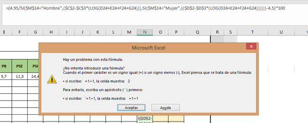 El resultado de la fórmula (resultado del porcentaje de grasa) aparece en la celda N24. Esta a su vez parte de los resultados de la ecuación que está en la celda U1. U1 equivale al cálculo de la desidad corporal, toma la sumatoria de los números que están de D24:G24.