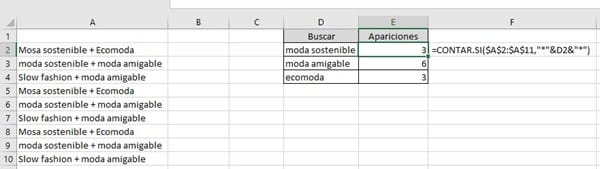 Quiero emplear la función contar. Si. Conjunto para filtrar una tabla de análisis de contenido, manejo criterios como "moda sostenible", "moda sostenble+moda amigable", "moda sostenible+ecofashion", etc. Solo quiero contabilizar el total de criterios con un mismo nombre, por ejemplo, el número de veces que se repite 'moda sostenible". Ojalá puedan ayudarme.