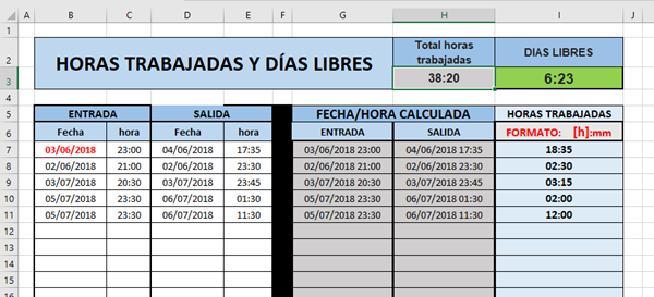 Por ejemplo tengo en una celda que se trabajó 20:30 formato hh:mm y necesito sacar cuenta cuantos días corresponde de descanso siendo que 6 horas trabajadas es 1 día de descanso. Yo se que tengo 3 días de descanso y me quedarían 2 horas 30 minutos para más adelante poder sumar a las siguientes horas trabajadas pero necesito una fórmula que me saque este calculo.