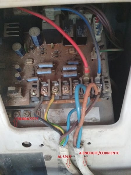 Tenía un sistema de 2 splits Panasonic pero uno falló y me lo dejaron en un solo split. El cable de corriente del motor a la corriente esta en mal estado y tengo que cambiarlo. Pero quiero aprovechar para poner todo bien y además conectar tierra que no tenía. Pongo una foto de las conexiones que salen del motor para que me digáis si puedo sanear algo y si la tierra es lo que creo que es. Repito, ahora el sistema solo tiene un Split. Como veis, los colores de los cables no corresponden a donde deberían. Espero haberme explicado y que la foto se entienda. Gracias de antemano!