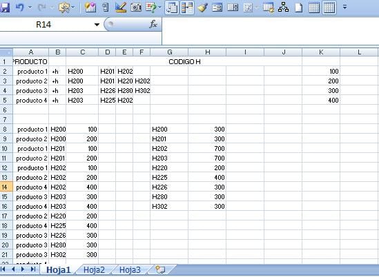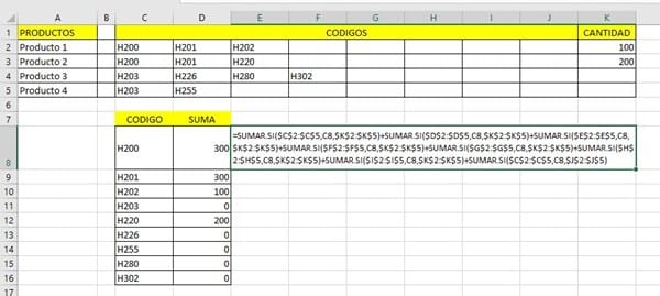 Necesito sumar las cantidades de cada producto para cada código coincidente. Es decir, obtener algo como: