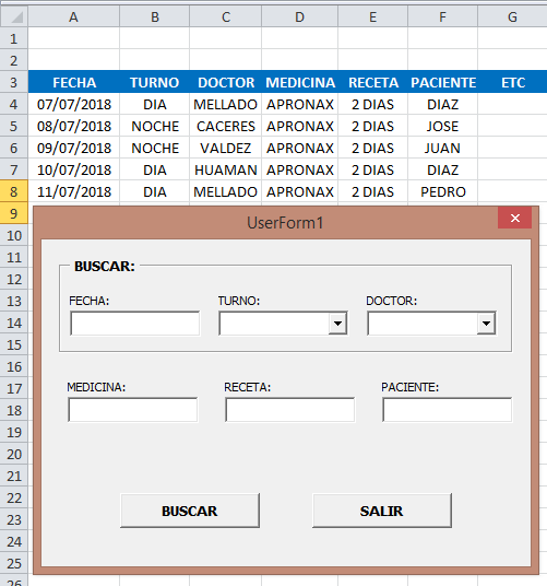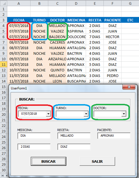 Engo una base de datos donde en la "columna A" está la Fecha (se pondría solo los números y automático se pondría los “/”), "columna B" Turno día o Noche(ComboBox1), "columna C" Idnombre del doctor(ComboBox2), en estas columnas serán para poner las condiciones los datos a buscar.