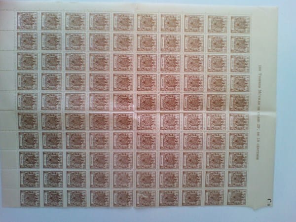 Me gustaría que me dijeran cuánto puede valer una lámina de 100 timbres móviles antiguos y un cuadernillo de sellos municipales, también muy antiguos. Les adjunto fotos.