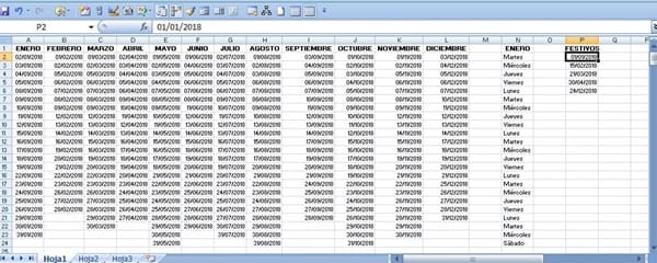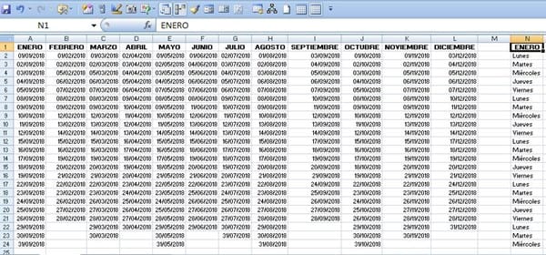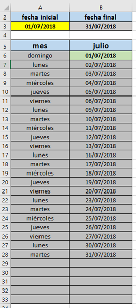¿Esta incompleto tu requerimiento quieres calcular las fechas excluyendo sábados y domingos dentro del mismo mes es decir todo Enero por ejemplo o bien quieres calcular la fecha de varios meses?, la macro que te paso elimina sábado y domingos y te crea un listado de fechas sin estas dos días, lo único que tienes que teclear es una fecha inicial en A2 y la macro se encarga de lo demás, nota el nombre de los días no va incluido en la macro solo es una referencia para mi de que la macro hace lo que debe,