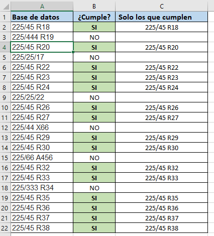 Estoy haciendo un trabajo de neumáticos y tengo una base de datos bastante grande. Mi problema es que necesito que las medidas de los neumáticos estén igual puestas, por ejemplo 225/45 R18, pero las hay que están distintas, como puede ser 225/25/17. Necesito una fórmula que me encuentre todas las celdas de la misma columna que no estén en el formato descrito antes (ancho neumático/paso de rueda Rdiámetro).