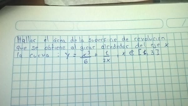 Cálculo daniel Addison el 16 jul. 18 Hallar el área de la superficie de revolución ¿Qué formula utilizo y desde que punto tomo para la integral definida? Seguir Siguiendo Dejar de seguir