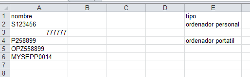 Si la columna A contiene una P+ 5 o 6 números detrás, que en la columna E me escriba ordenador portátil.
