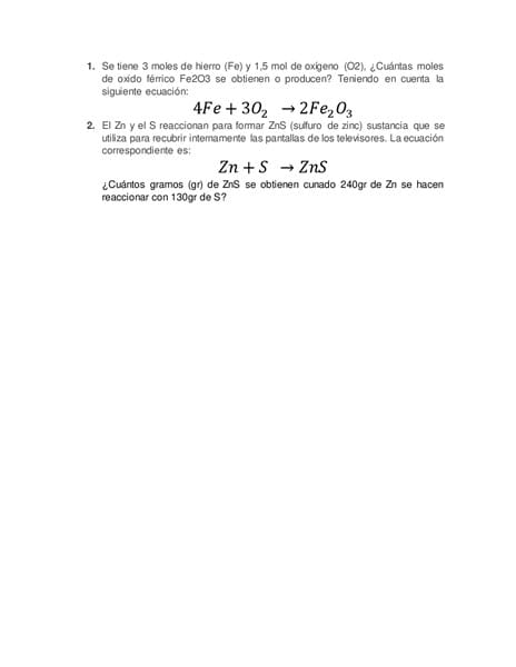 El primer ejercicio es incluso más sencillo puesto que los datos no están en gramos sino en moles. Le invito a desarrollarlo, son máximo tres reglas de tres. Comente su resultado en caso de problemas y se le ayudará.