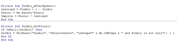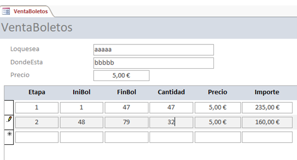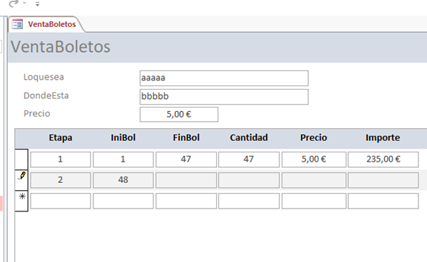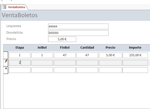 tengo una tabla tbl_ventas_boletos con Id_etapas como clave secundario(autonumerico) y este enlazo con otra tabla tbl_detalles_etapas(Id_etapas, Etapas_1, Ini_bol1, Fin_bol1, Precio_bol, Cant1(Fin_bol1)-(Ini_bol1), Importe1(Cant1)*Precio_bol1, Etapas_2, Ini_bol2, Fin_bol2, Precio_bol, Cant2(Fin_bol2)-(Ini_bol2), Importe1(Cant2)*Precio_bol1....hasta 10 etapas, necesito que el campo Ini_bol2 estire el valor de Fin_bol1 y asi para el resto, de modo a ir tipeando solo el ultimo rango, el precio tiene que traer de la cabecera..