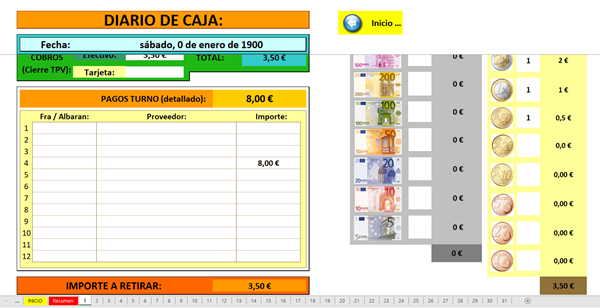 Pero como dicho si pongo una moneda de 2 €, una de 1€ y 1 de 0,50@, total 3,5€, se queda en total 0€ hasta que no marque algo en la celda de los céntimos...