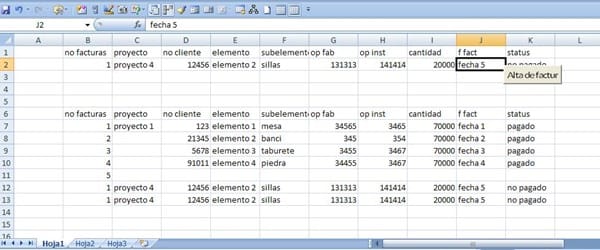 Columna B: Contiene un listado de validación de datos, únicamente seleccionas (es importante señalar que la información de la validación de datos se alimenta de la hoja llamada listados y a su vez la hoja de listados se alimenta de otro archivo llamado Proyectos, conforme van aumentando los proyectos se actualiza la hoja de listados y a su vez va actualizando la validación de datos de la hoja de Facturación.)