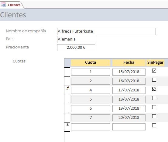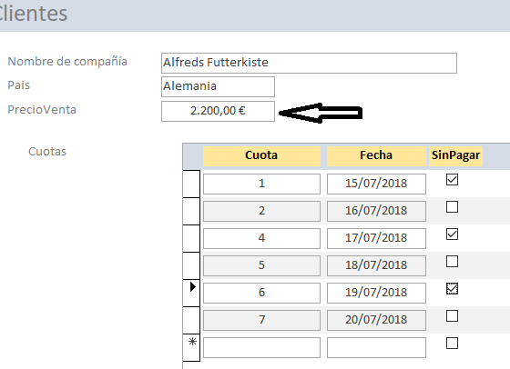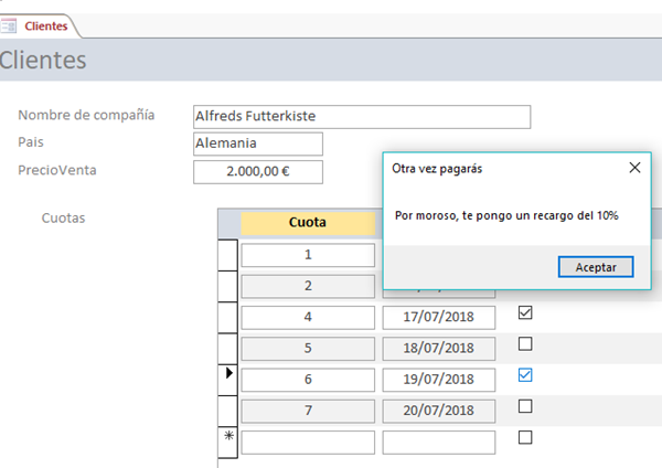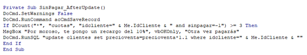 Me pasa lo siguiente. Tengo un formulario con un subformulario en el que busco el cliente y me parece sus datos con las cuotas pagas e impagas. Las cuales las manejo con un SI/NO . Ahora lo que yo quiero es que pasadas las 3 cuotas impagas ( osea 3 SI/NO vacíos) me calcule un interés sobre el precio de venta. Por favor que alguien me ayude.. No se si me expresé bien. Cualquier cosa mando programa por email para que lo entiendan mejor.