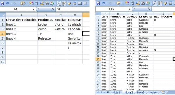 Por ejemplo, selecciono Leche y en la columna de Líneas me deja marcar sólo la L1, y al marcar sólo L1 que me salgan sólo las botellas que pueden ir por dicha línea, por lo que al final tengo todas las combinaciones reales que se pueden hacer con la leche.