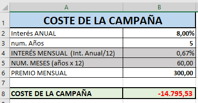Tengo que hacer una campaña publicitaria con premio. Se trata de un juego en el que al ganador se le da un premio que consiste en pagarle 300 euros cada mes durante 5 años. El tipo de interés anual que me cobra el banco es el 8% anual y necesito saber cuanto me va a costar la campaña.