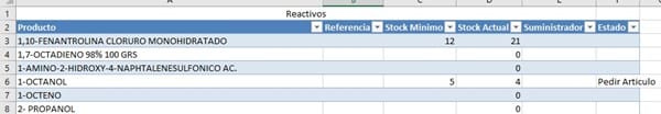 El tema seria que en la hoja en questión es la 4 de un libro excel. En la columna A habría el nombre del producto, en el C el Stock mínimo, en el DE el Stock actual y por ultimo en el F una señal de pedir articulo.