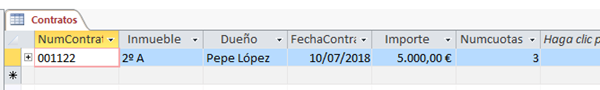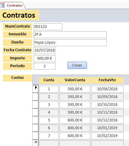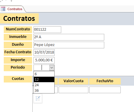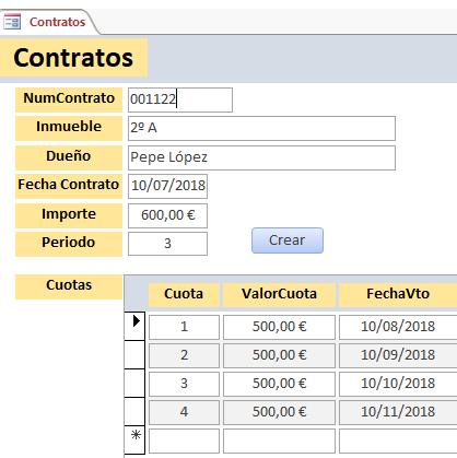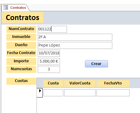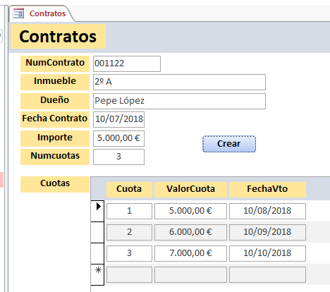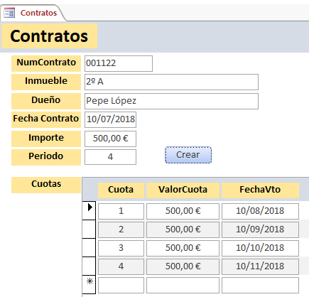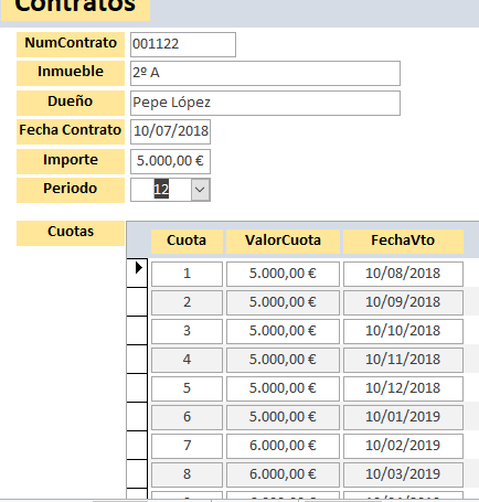 El contrato se guarda en una tabla con más columnas y las cuotas se guardarían en otra tabla relacionada que seguramente también tendrá algún otro campo, pero serían datos irrelevantes para la acción.