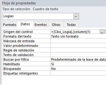 por aquí de nuevo con otra pregunta, tengo un cuadro combinado (Cbo_Logia) y un cuadro de texto (txt.Logias), tengo el cuadro combinado con 2 columnas, 1- Numero_Logia y 2- Nombre_Logia lo que se quiere es que en el cuadro combinado salga la columna 1 que es donde están los números y en el cuadro de texto salga el nombre de la logia de hecho ya sale así pero cuando quiero ver los registros uno por uno entonces se mueve el cuadro combinado pero el cuadro de texto se queda en el ultimo registro guardado y no se mueve, le coloque este coloque este código Me.txt.logias = Me.Cbo_Logias.Column (2), me muestra la columna 2 en el txt pero al ir al siguiente registro el txtlogias se queda paralizado, que puedo hacer por favor.