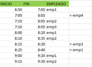 Entonces tengo que ir buscando quien puede hacer la primera tarea que esta sin asignar empleado, primero entre los que están trabajando y si estos no pueden, pues asigno uno nuevo. Una vez asignados, pueden entrar nuevas tareas y tengo que realizar nuevas asignaciones.