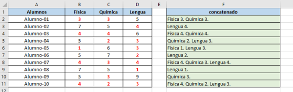 Lo que me interesa es si exite la función de concatenar en otra celda unicamente si han suspendido la asignatura (Menos de 5). De ese modo que me apareciera el nombre de la asignatura y la nota a continuación de todas las suspendidas (P. Ej. Fisica3, Química2, Lengua4)