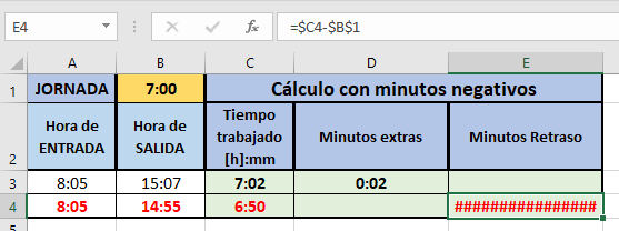 El problema es cuando la diferencia entre dos valores, en horas y minutos, es negativa. Nos salen valores "raros", como en este ejemplo de una hoja excel: